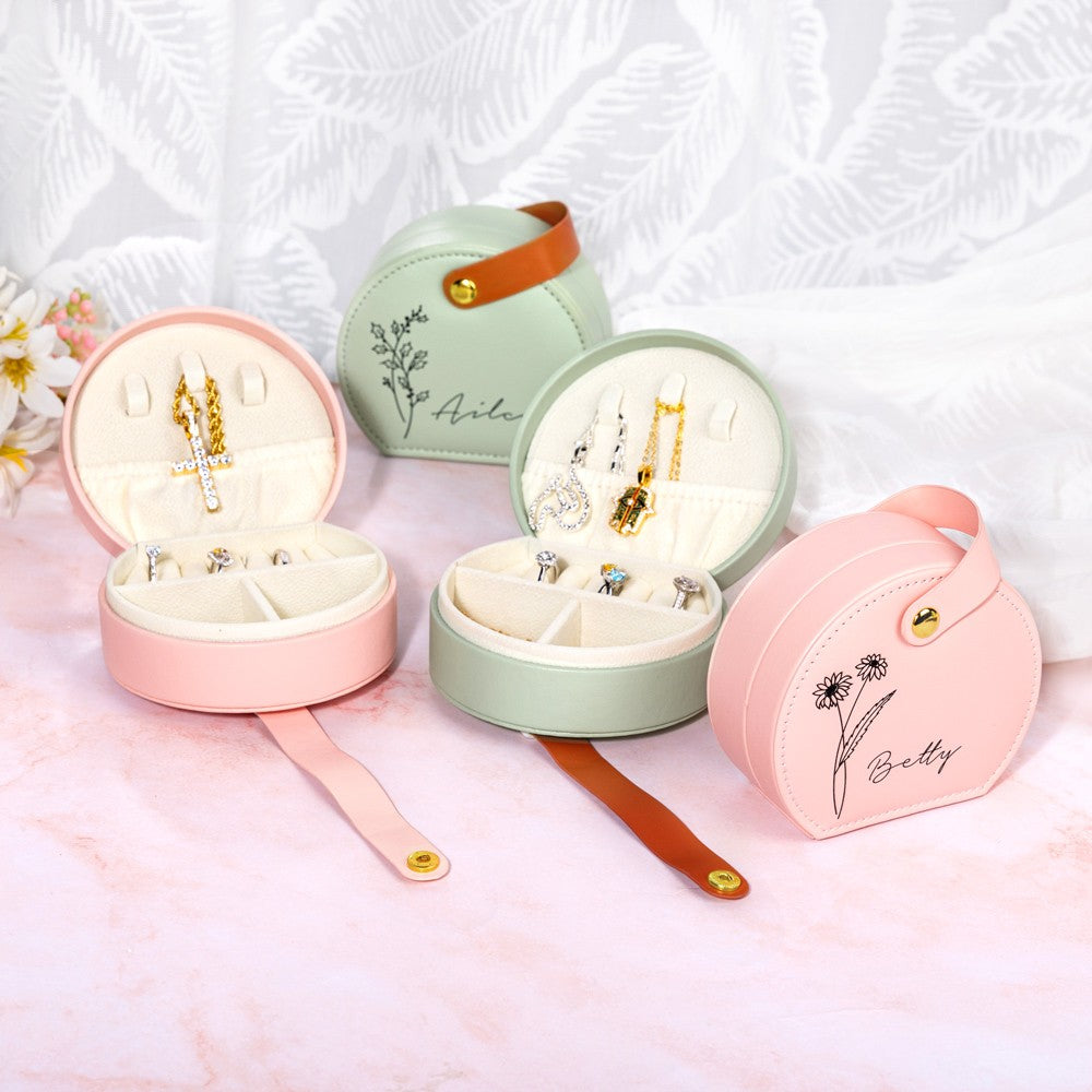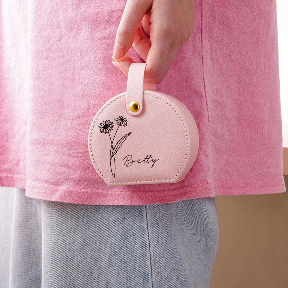 Custom Birth Flower & Name Hand-Held Jewelry Bag, Personalized Portable Floral Travel Jewelry Case, Birthday/Wedding/Anniversary Gift for Women/Her
