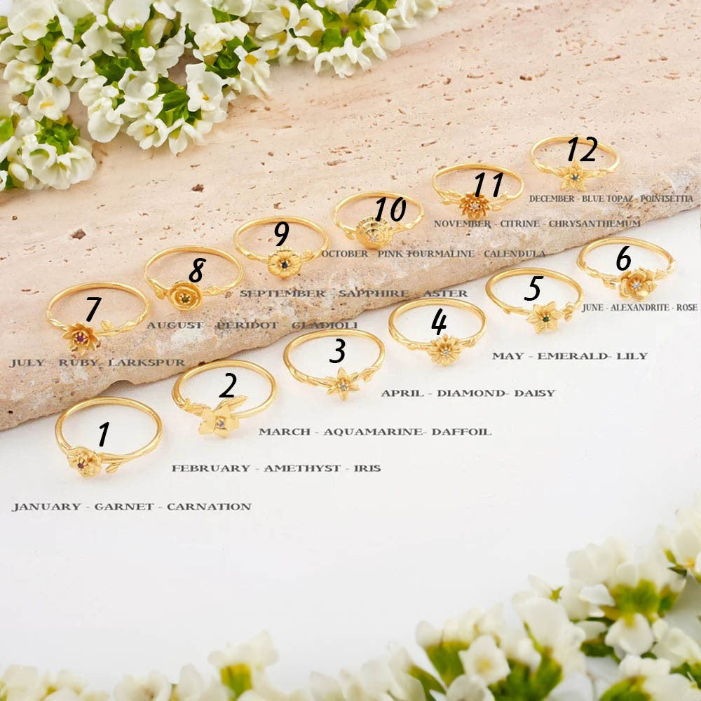 Personalized Birth Flower Ring - This distinctive ring adorned with your chosen birth flower and birthstone is a captivating and stylish choice that perfectly complements your personal fashion. Its delicate and refined design adds to its allure, and each ring conveys a unique significance associated with the birth month's special flower.