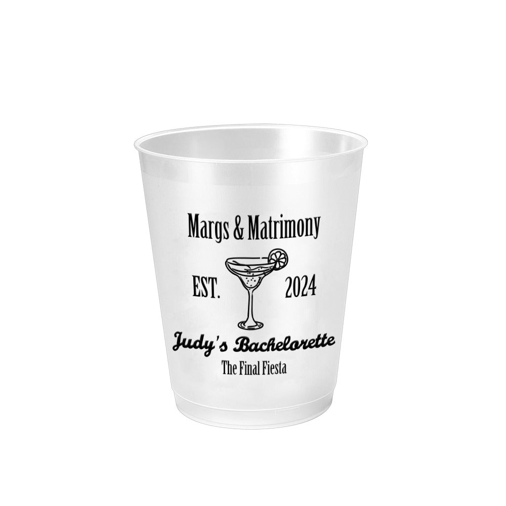 Personalized Drinking Cups - These plastic disposable cups featured with quote "Margs & Matrimony" can be customized with year and special text, adding a unique and stylish touch to your bachelorette party or bridal party.