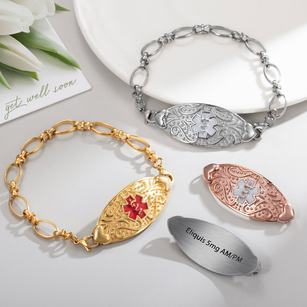 Beautiful and Practical - More stylish and elegant than the average medical bracelet. You can engrave the personal name on it, making the bracelet more distinctive and beautiful yet stands out as a practical medical alert.Material - Made of medical 316L stainless steel (hypoallergenic and safe for people with allergies), it is perfectly connected with elegant metal chains, designed to provide emergency responders with a stylish look and highly visible chain.