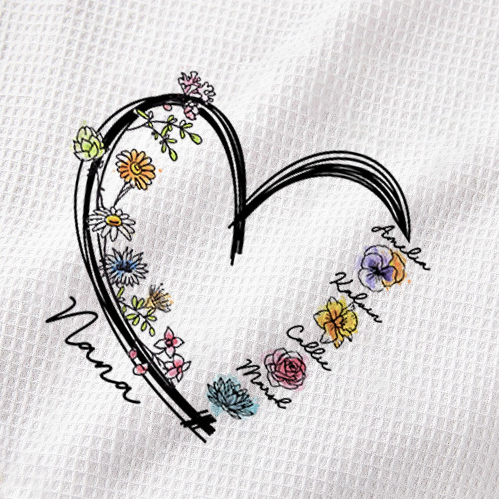 Personalized - This 100% cotton waffle weave towel is customized with 1-6 names and birth flowers and features a heart detail, creating a unique and thoughtful kitchen accessory.
