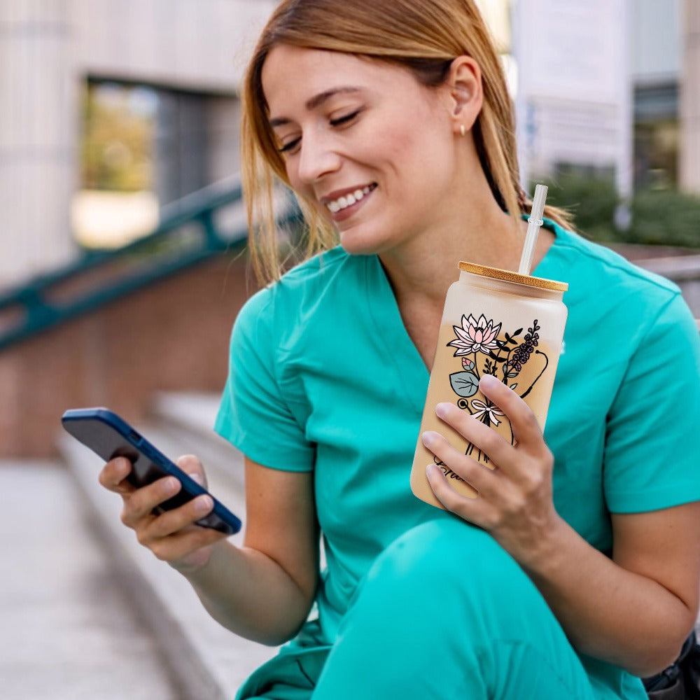 Custom Glass Cup - This glass cup features the recipient's birth flower, custom name and a stethoscope design, reflecting their medical profession with elegance. The birth flower representing the recipient's birth month and the special name add personal touch to their daily accessories.