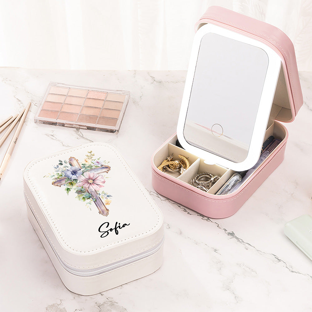 Custom Name Cross Birth Flower Makeup Box with Three-Color Adjustment LED Light Mirror, Travel Jewelry Makeup Box, Christian Gift for Her/Mom/Women
