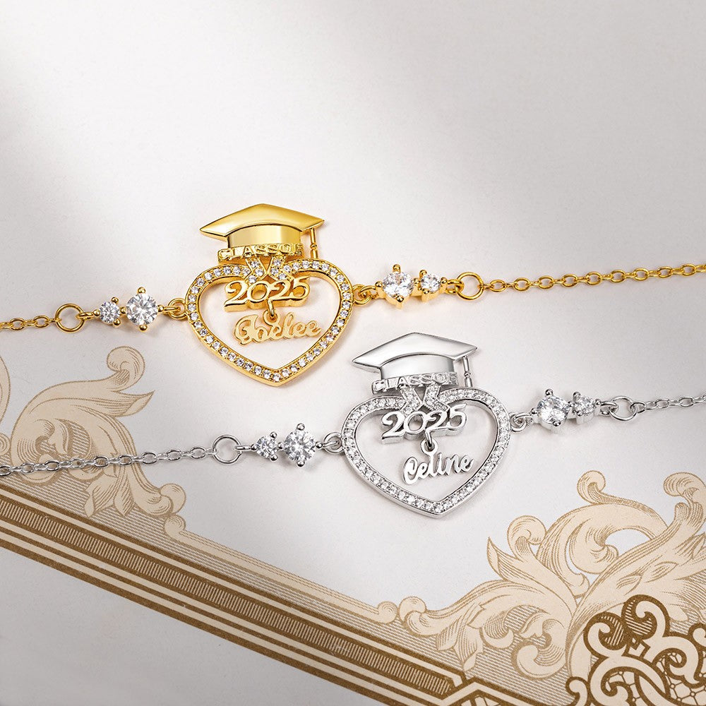 Custom Name Graduation Cap Heart Bracelet with Cubic Zirconia, Sterling Silver 925 Class of 2025 Graduation Jewelry, Graduation Gift for Graduates/Her