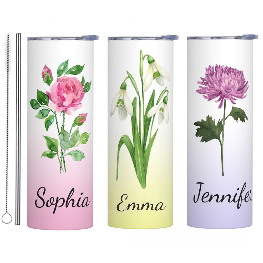 Custom Birth Flower & Name - Each tumbler exhibits a watercolor birth flower gradient design personalized with the recipient's name, adding a unique touch to the present.