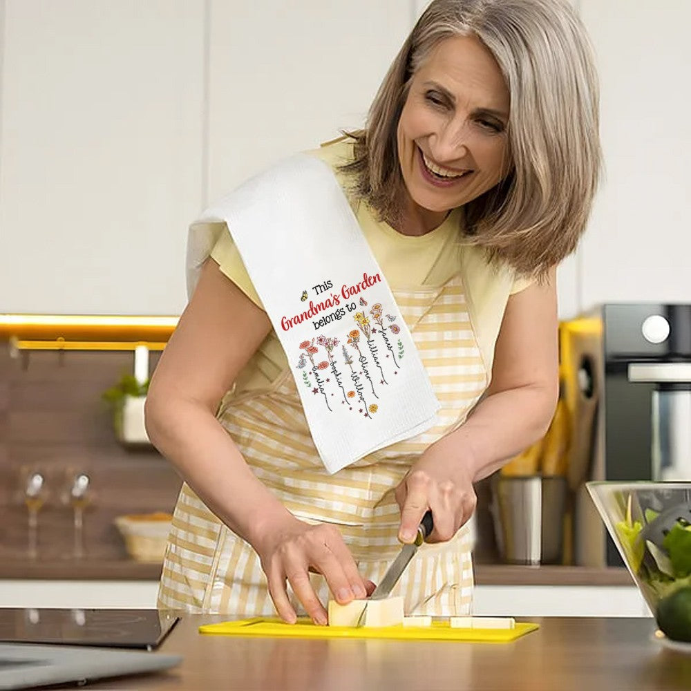 Custom Names & Birth Flowers Grandma's Garden Waffle Weave Dish Towel, Tea Towel, Kitchen Accessory, Housewarming/Mother's Day Gift for Mom/Grandma