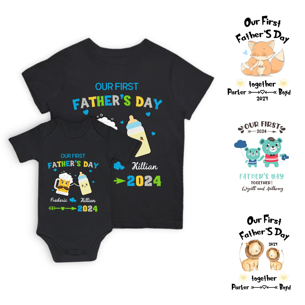 Custom Our First Father's Day Parent-Child Clothing Matching Shirts, Fox Bear Lion Cotton Daddy T-Shirt & Baby Bodysuit Set, Gift for New Dad/Newborn
