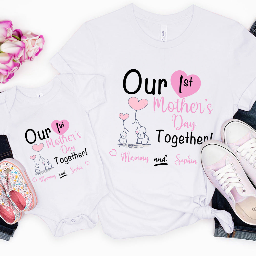 Custom Our First Mother's Day Parent-Child Clothing Matching Shirts, Elephant Balloon Cotton Mom T-Shirt & Baby Bodysuit Set, Gift for New Mom/Newborn