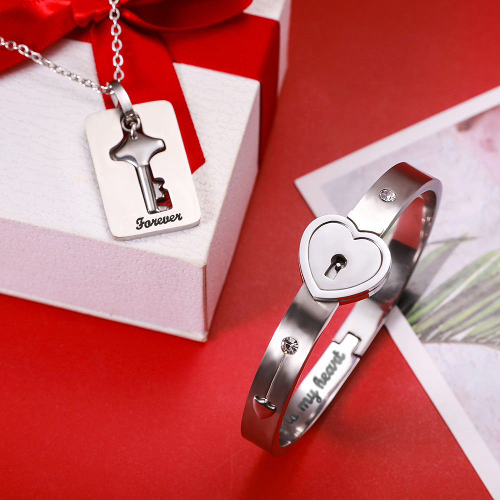 The genuine guarantee of love - These Heart Lock Bracelet Key Necklace is the true promise of real love for couples. The Key of the necklace is designed for unlocking the heart-shaped lock of bracelet making it a unique gift for romantic occasions. This heart lock signifies that never-ending state of your love, never to leave yourselves forever.
