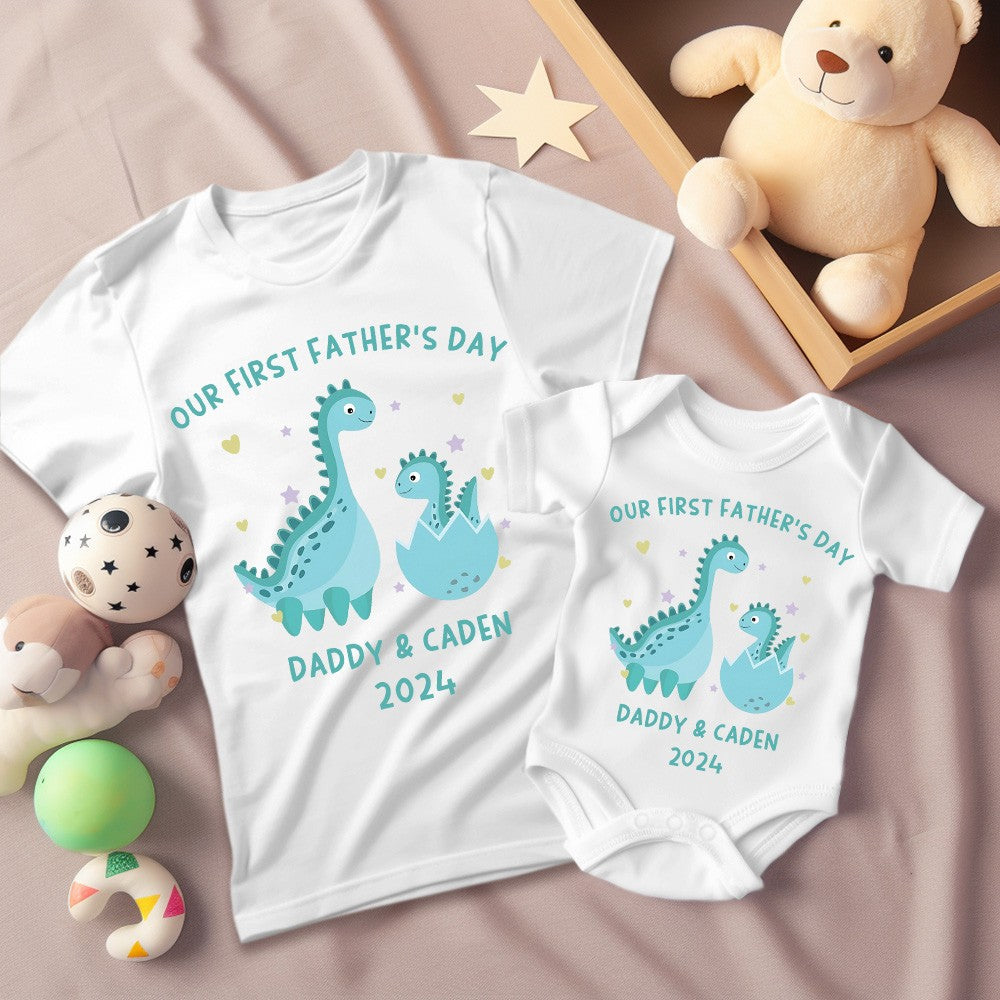 Customized Dinosaur Name Parent-child Shirt, Our First Father's Day Shirt, Cotton Father&Baby Bodysuit, Birthday/Father's Gift for Dad/Grandpa