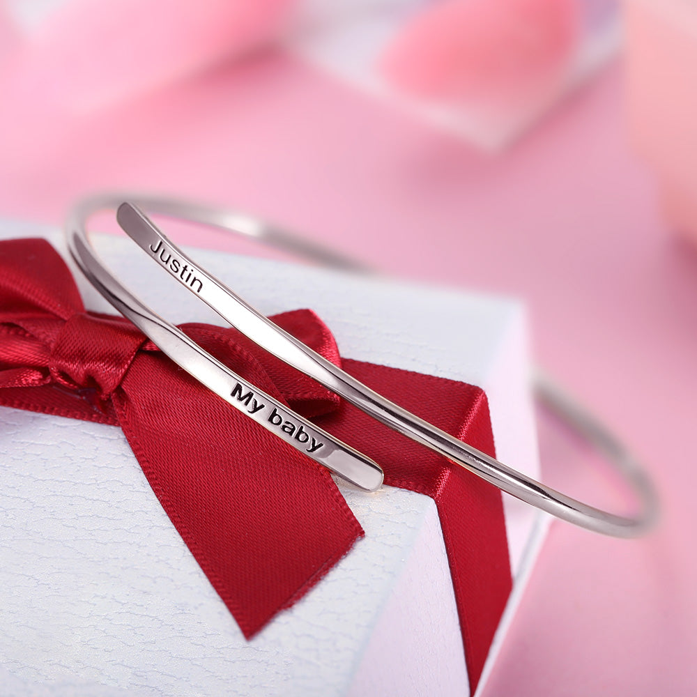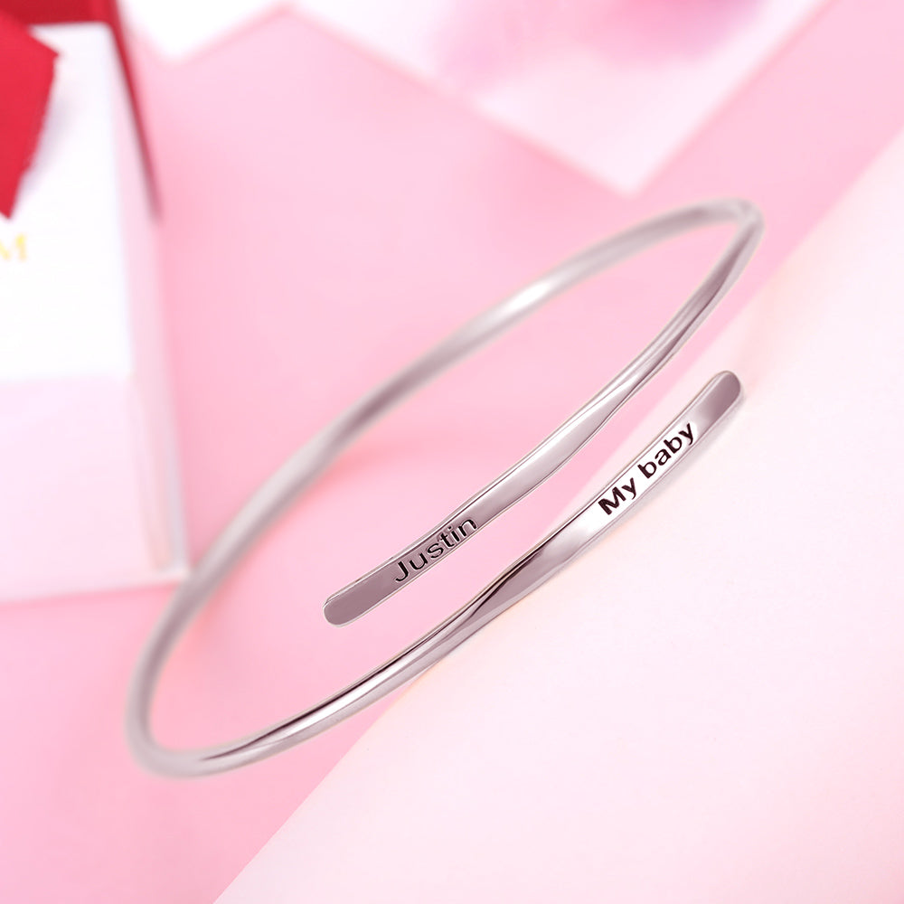 Add some glam to your daily look! Wear your name with pride with this adjustable engraved bracelet. Dainty details and the design of sleek smooth silhouette make the jewelry a beautiful piece that is suitable for any girl, also a great addition to any jewelry lover's collection. This name bracelet also can be so meaningful to the wearer: you can customize it with 2 names of your special ones to give it to a loved one as a thoughtful gift.