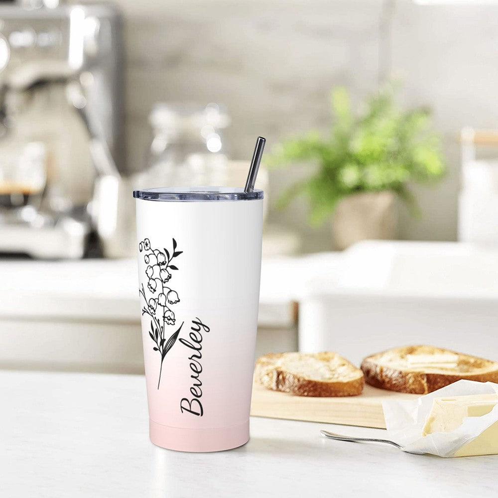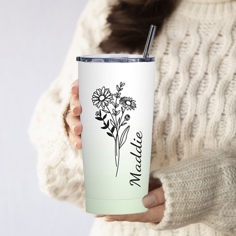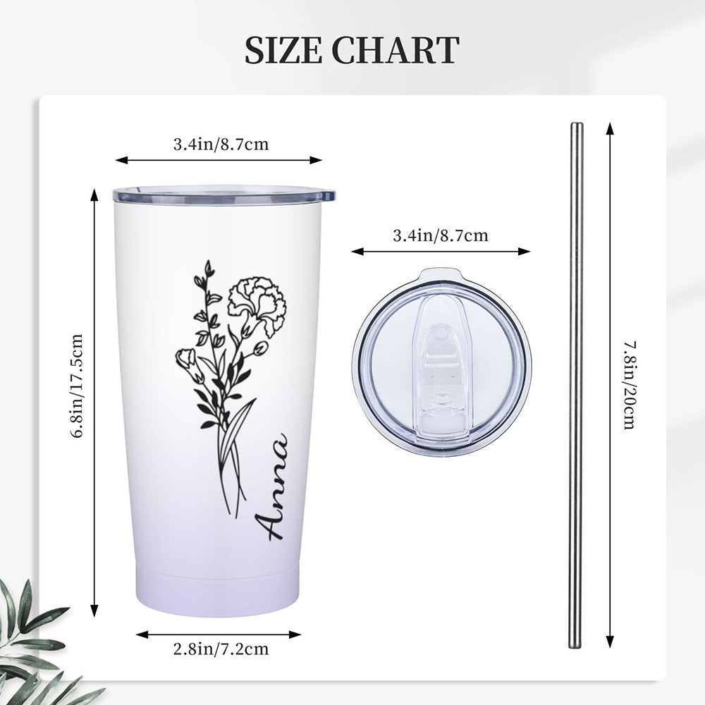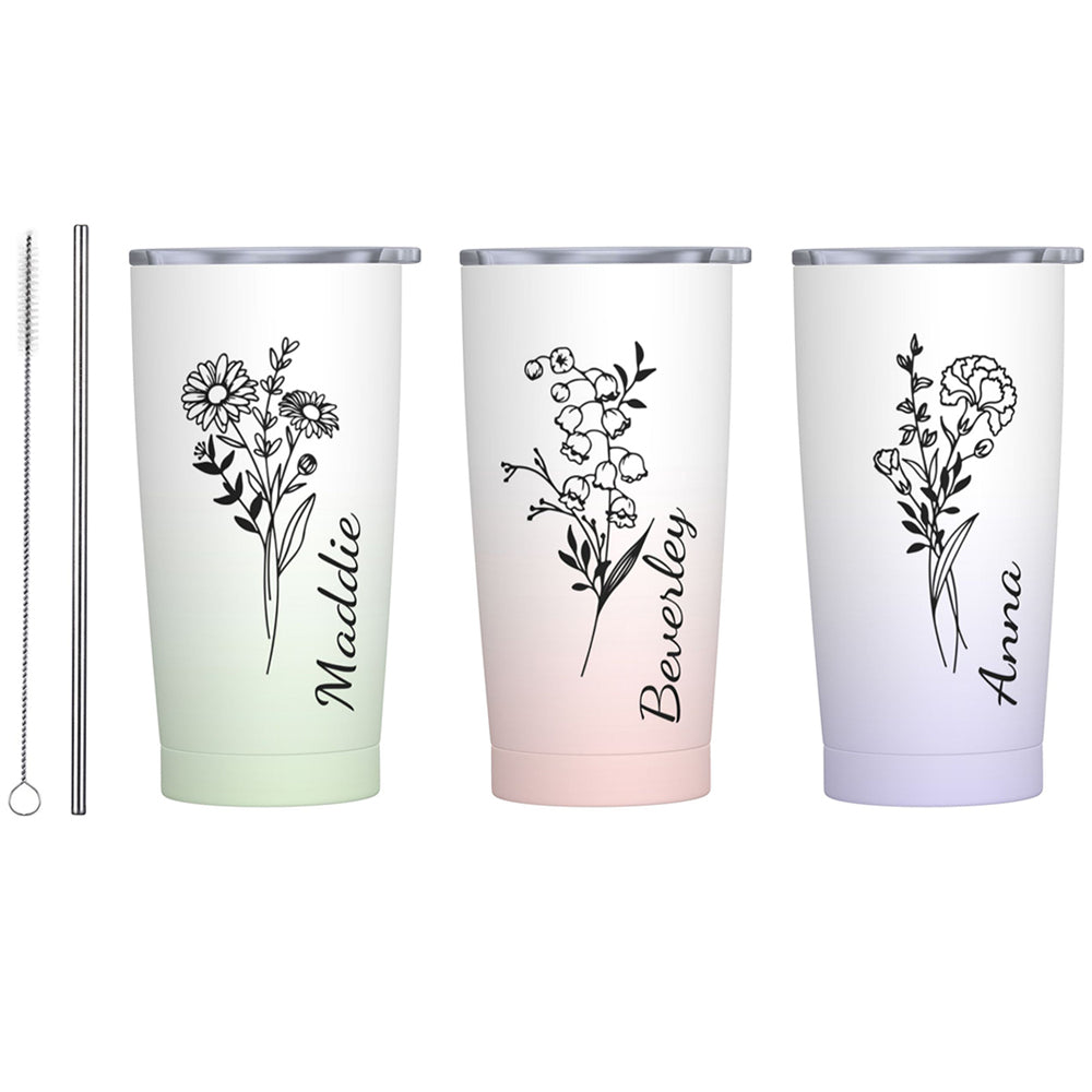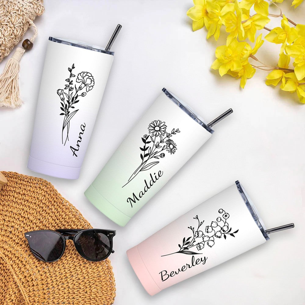 Personalized Birth Flower Gradient Coffee Tumbler, 20oz Name Tumbler with Straw & Lid, Travel Tumbler Cup, Birthday Gift for Family/Friend/Bridesmaid