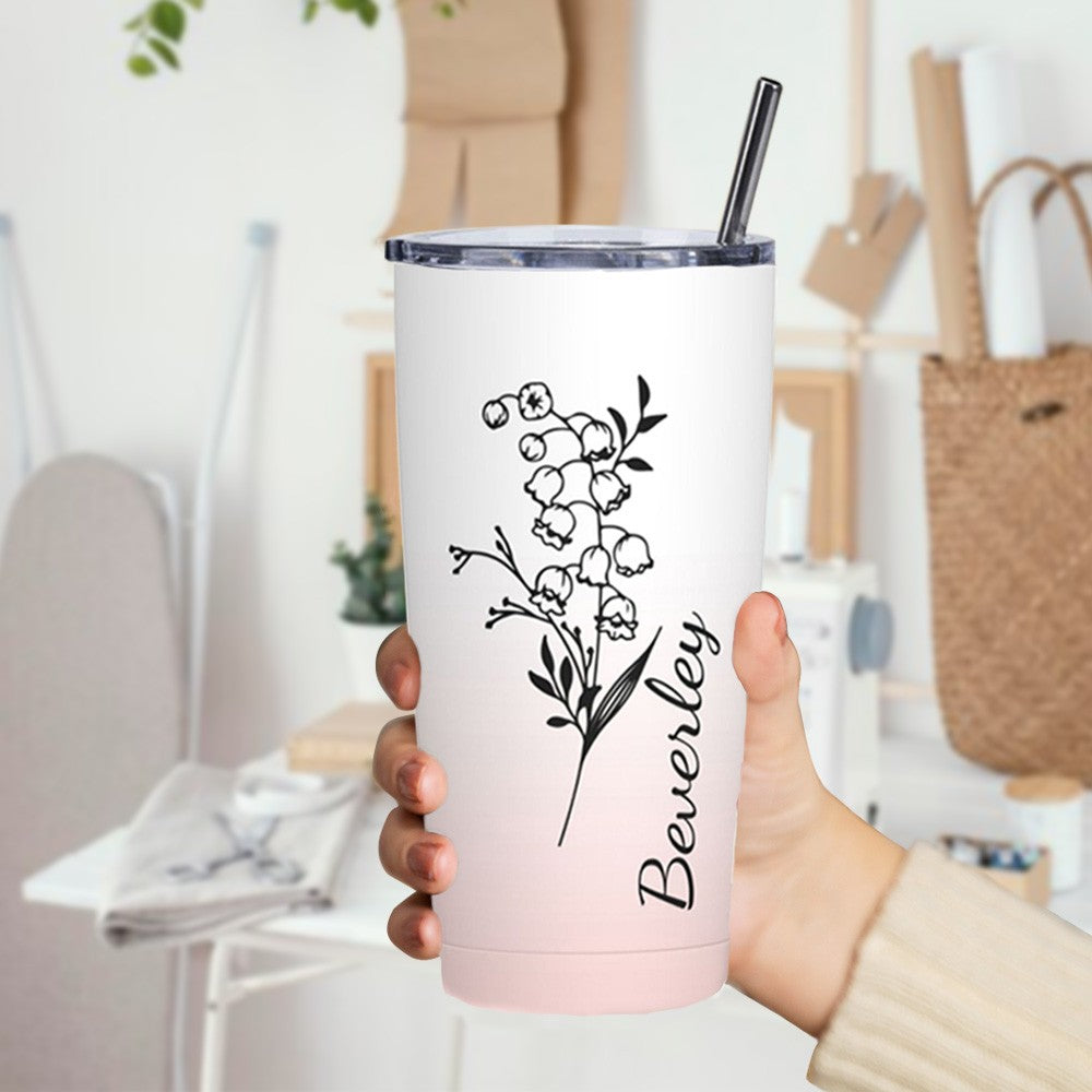 Custom Birth Flower & Name - Each tumbler exhibits a beautiful birth flower gradient design personalized with the recipient's name, adding a unique touch to the tumbler.
