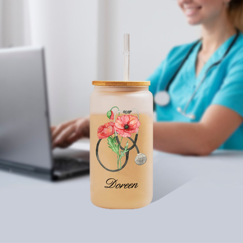 Unique Design - The cup is made of frosted glass, giving it a stylish and contemporary look. The stethoscope design adds a medical theme to the tumbler. It provides a comfortable grip and keeps beverages at an enjoyable temperature. The cup comes with a bamboo lid and a reusable straw.