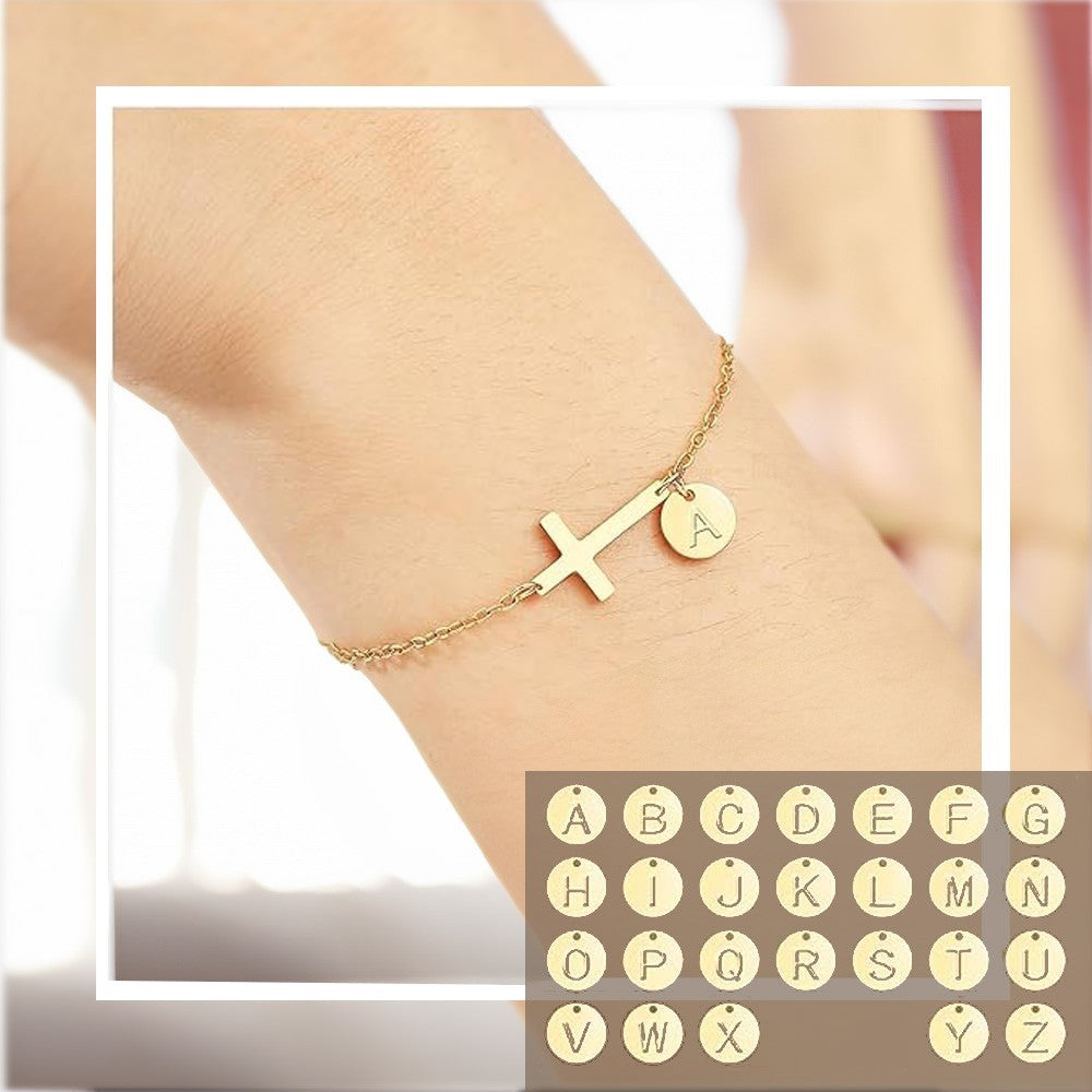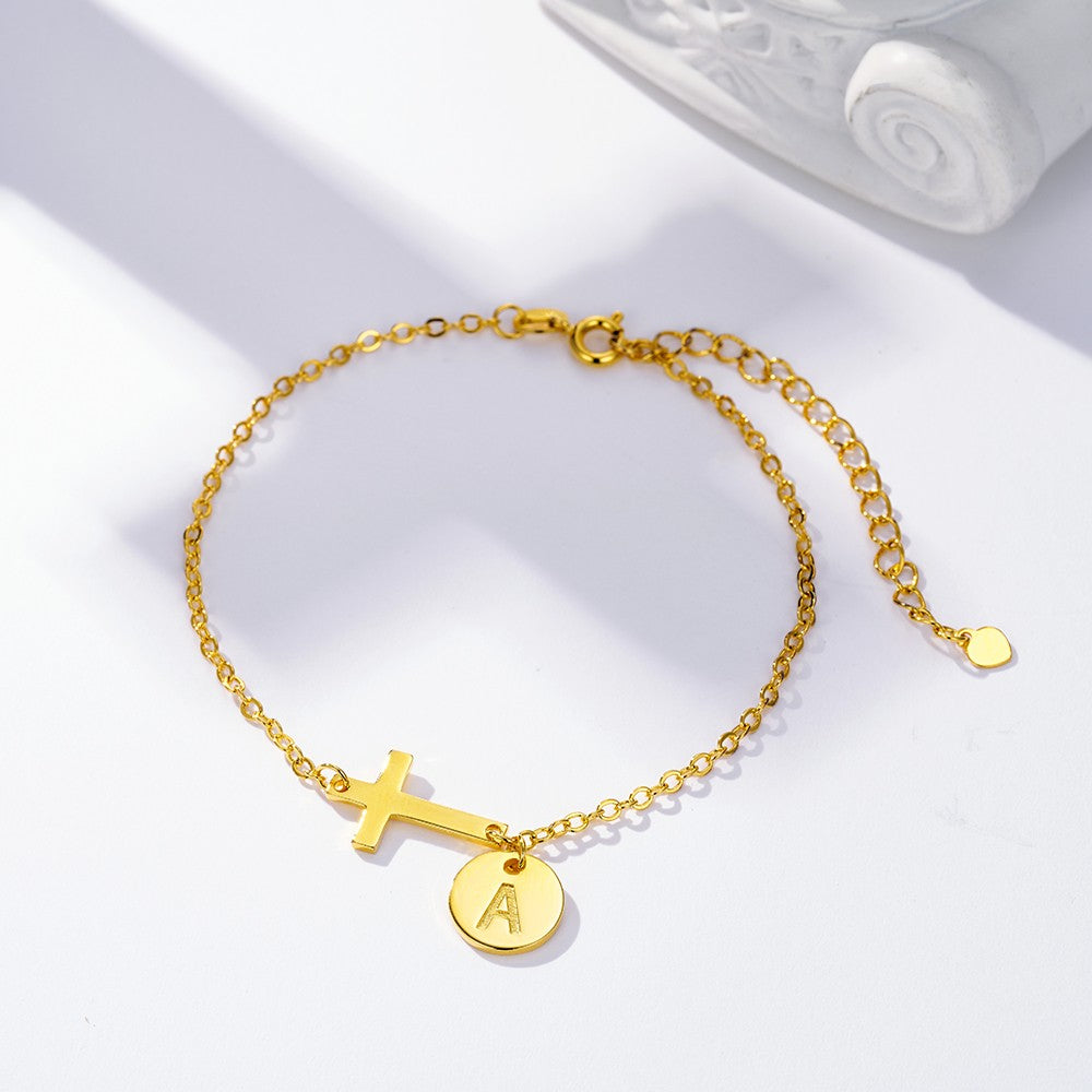 Custom Cross Initial Disc Bracelet - This bracelet features a cross symbol and a disc which can be customized with the initial of your choice, adding a personal touch to your jewelry collection.