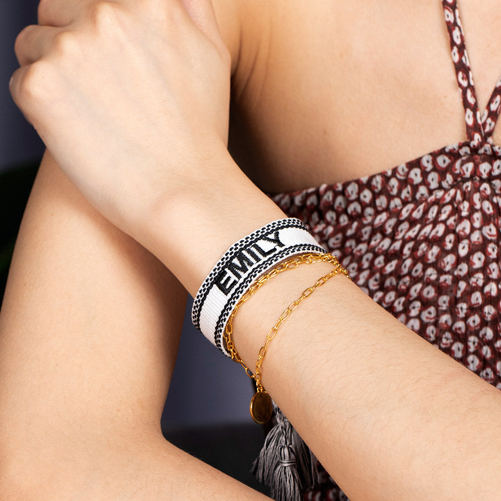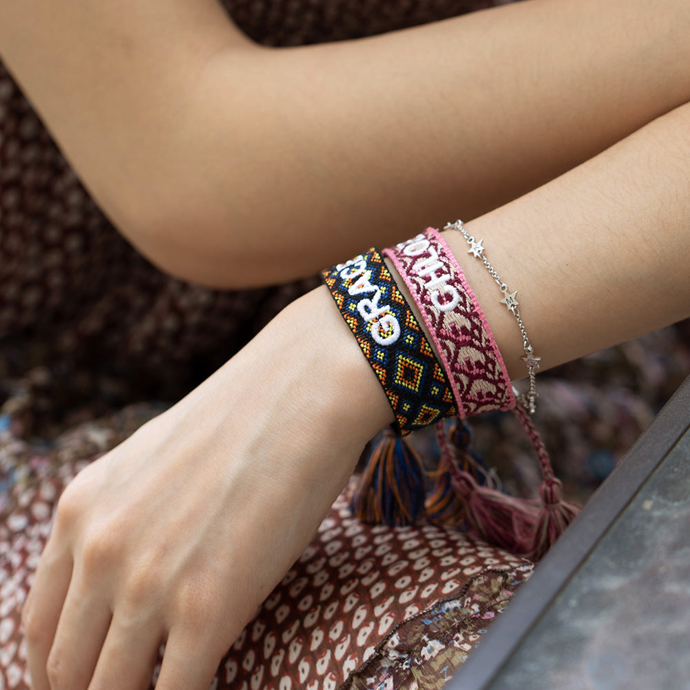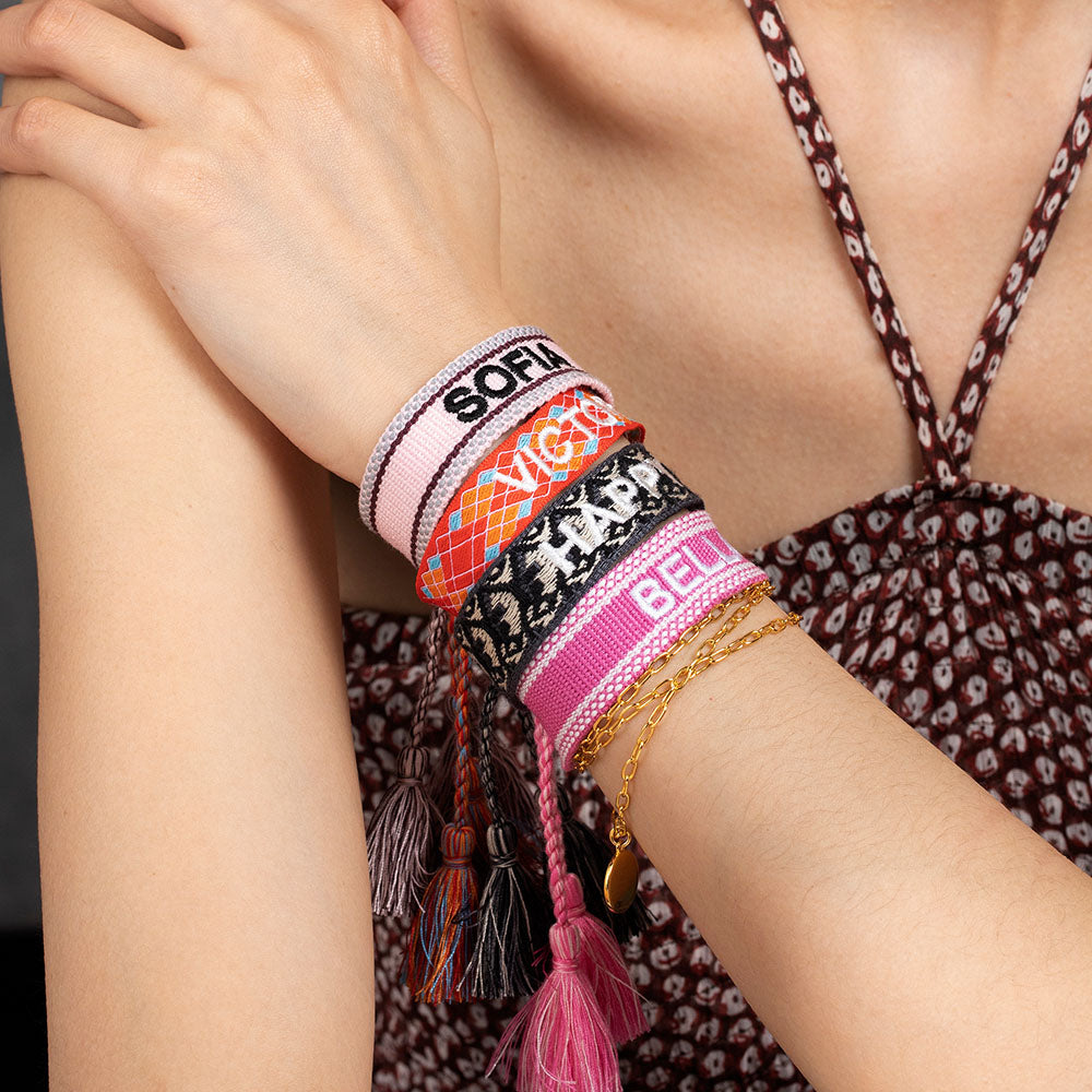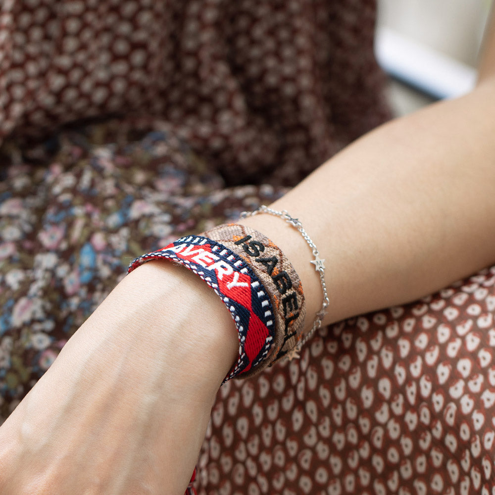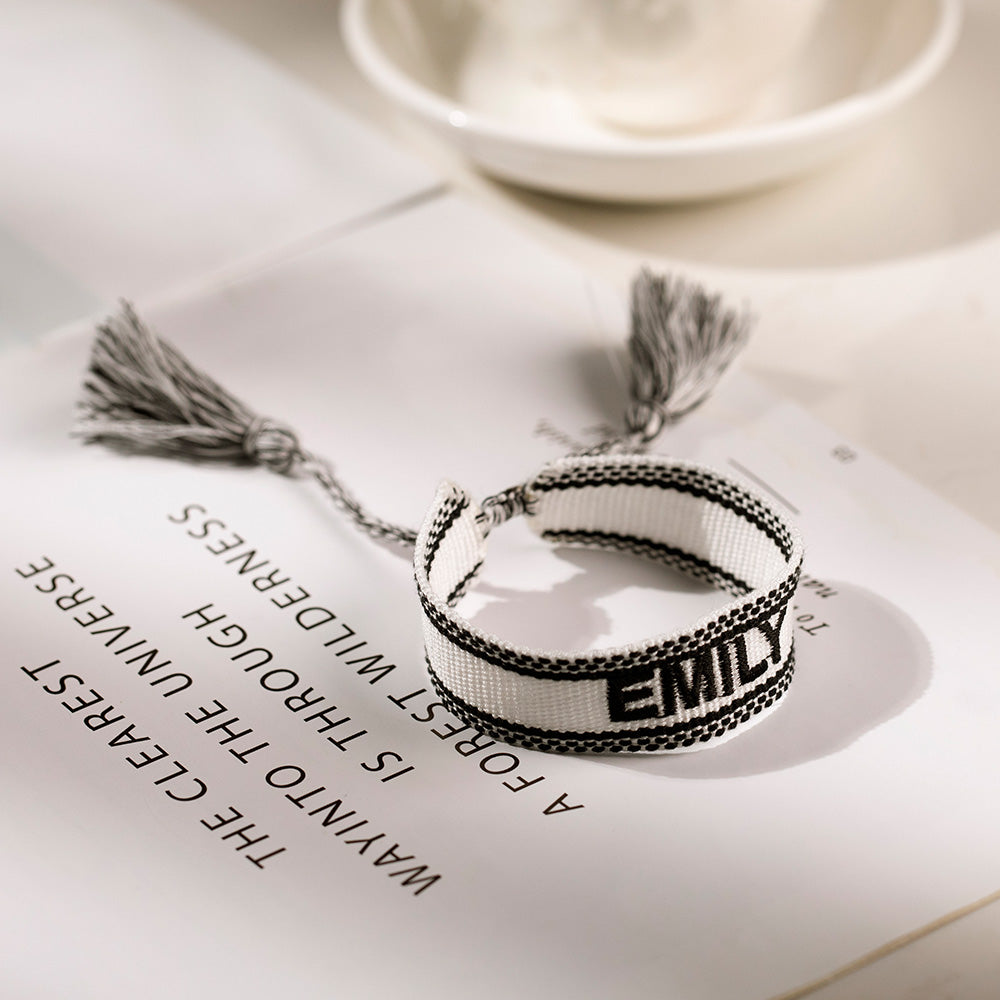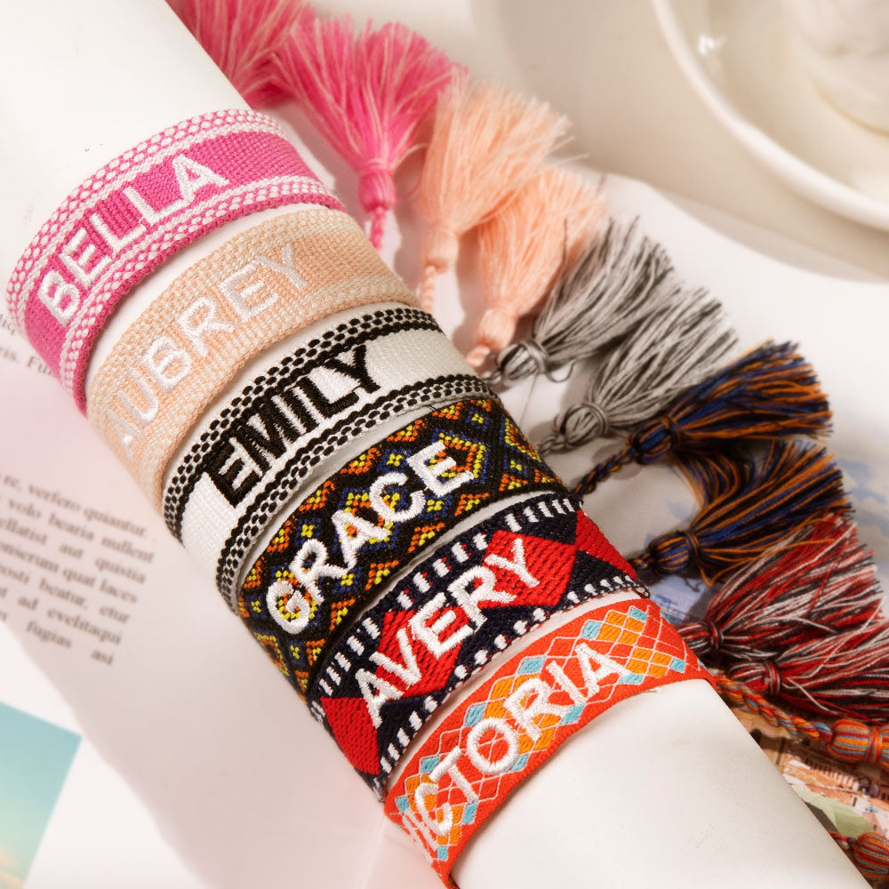 Personalized: This personalized bracelet is hand-woven in a variety of color options and text, and you also can create your own design that includes names, lucky numbers, or special dates.
