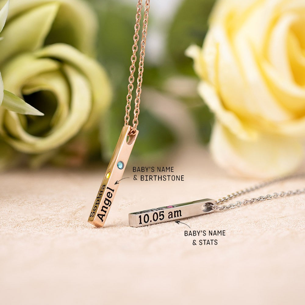 Personalized - Each side of the bar on this necklace can be engraved with the newborn's name and birthstone, serving as a precious memorial of the momentous occasion of the baby's arrival. This customization option allows the new mom to carry a constant reminder of her child's birth close to her heart.