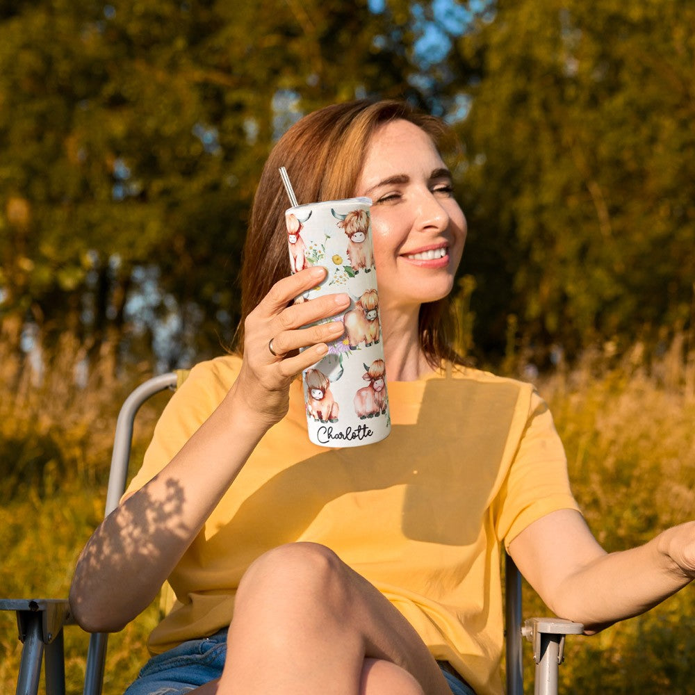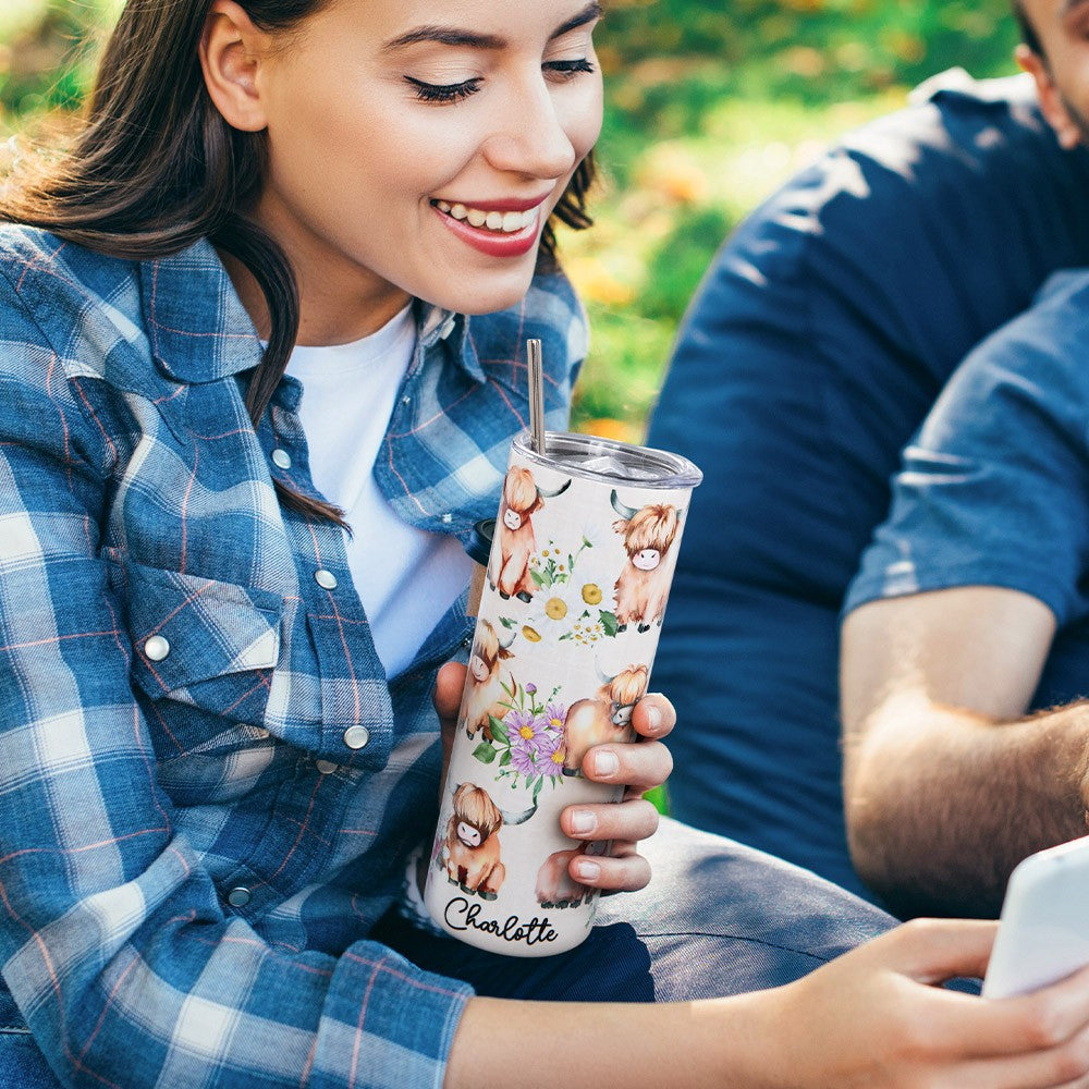 Personalized Touch - This tumbler features adorable highland cows with floral design, which can be customized with a special name, making it a unique and personalized gift for any cow lover.
