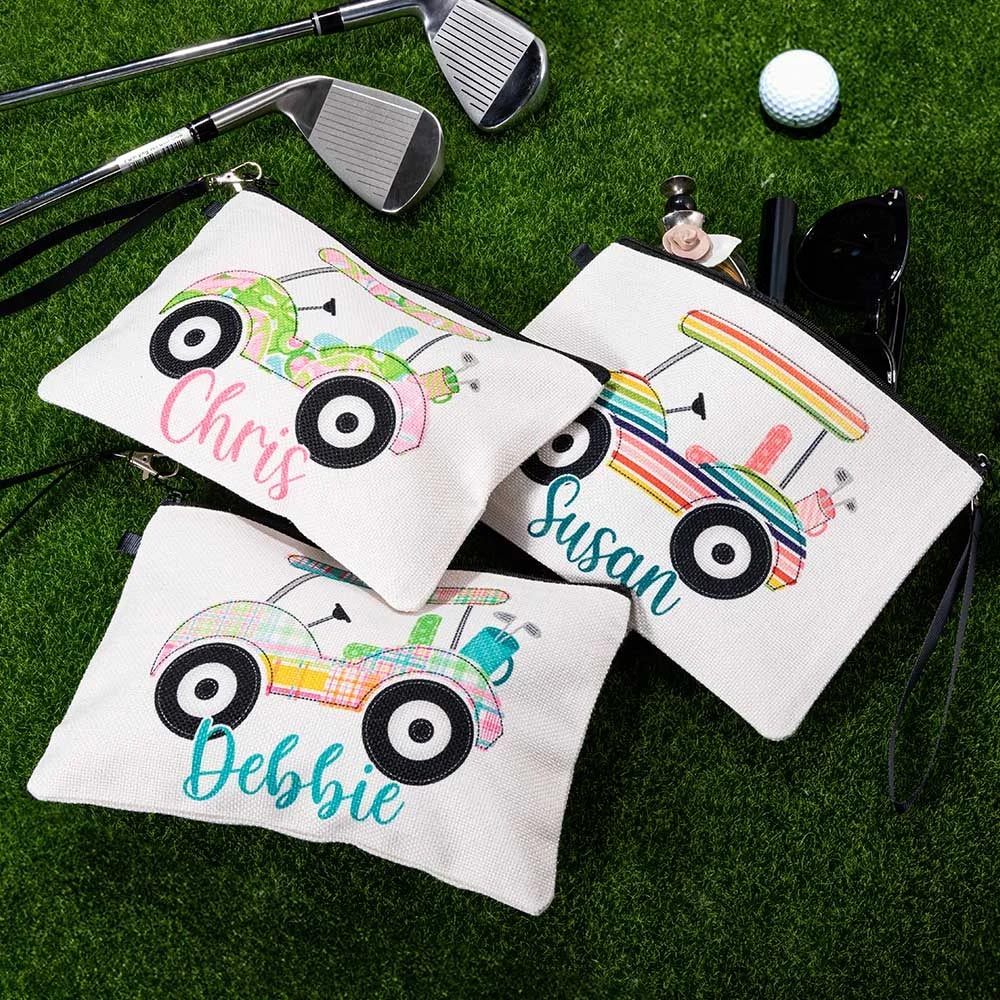 Golf Gift - This personalized cosmetic bag is an ideal gift for golfers, coaches, or women who enjoy the game. It combines practicality, style, and personalization, making it a thoughtful and functional gift choice. The custom name and the golf cart design add a unique touch, reflecting the recipient's passion for golf.