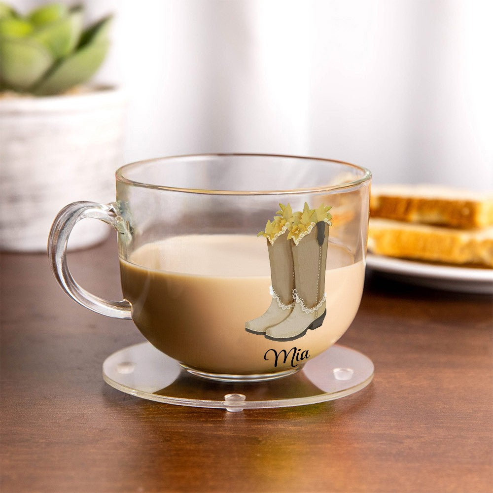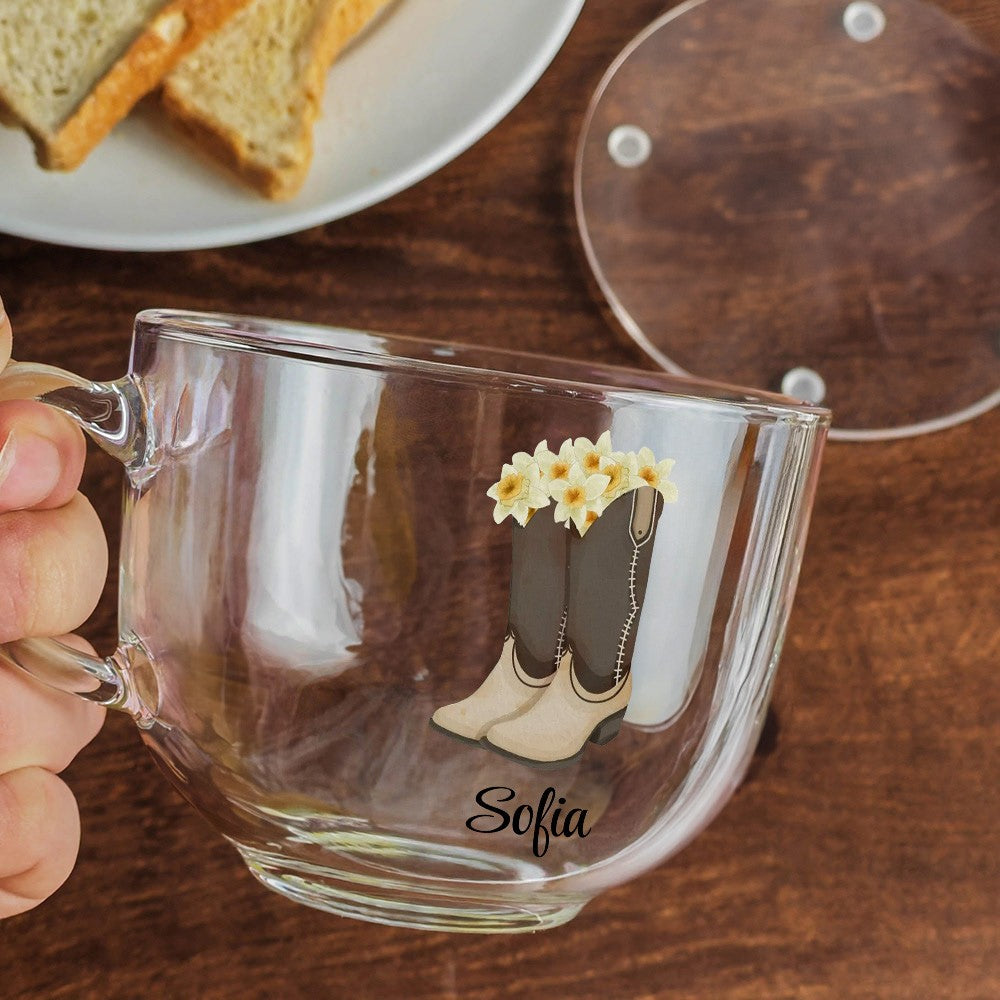 Personalized Name Cowgirl Birth Flower Mug, 11/16oz Floral Western Boots Glass Cup/Ceramic Mug, Birthday/Wedding Gift for Rodeo Girls/Bridesmaids