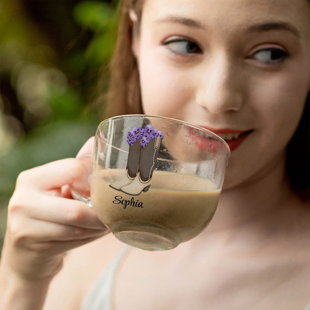 Charming Western Design - This mug/glass features a fun cowgirl theme with detailed illustrations of western boots and delicate birth flowers, combining rustic charm with a floral touch. Its stylish and cozy shape feels great in hand, whether you choose the 11oz ceramic mug option or the 16oz glass cup version.