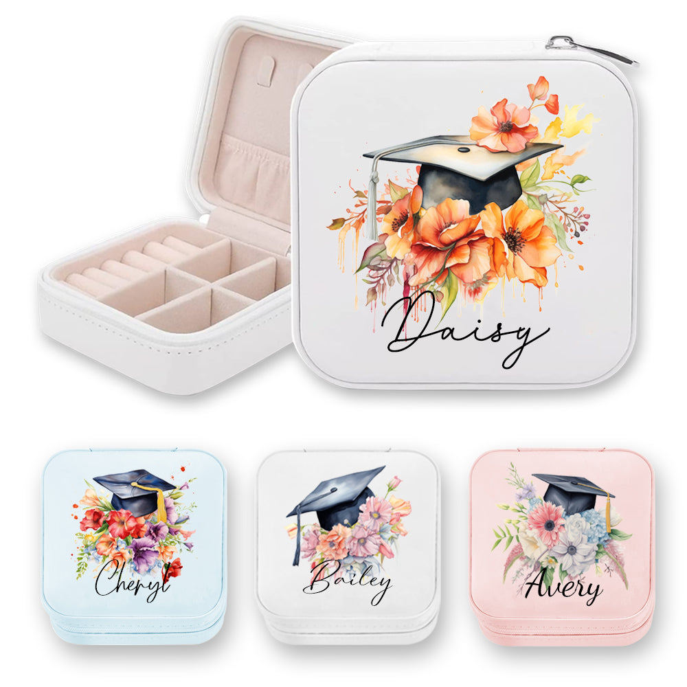 Personalized Name Graduation Cap Flower Leather Jewelry Case, Bouquet of Flowers Travel Jewelry Box, Graduation Gift for Her/Family/Friends/Classmates