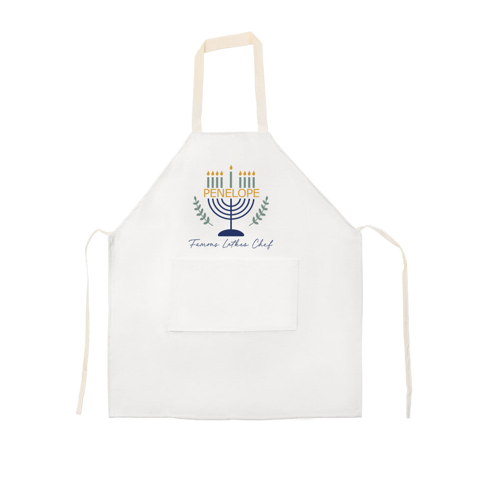 Custom Design - This menorah design apron can be customized with a name and a text, adding a personalized touch to the towel. Featuring a charming menorah design, this apron embodies the spirit of Hanukkah, making it a festive and meaningful addition to your kitchen attire.