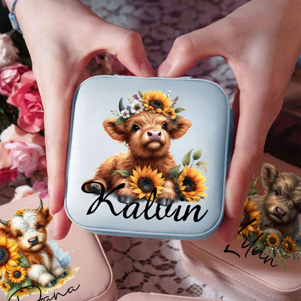 Custom Jewelry Case - This jewelry case can be customized with a specific name, adding a unique and personalized touch to the organizer. It is a special and thoughtful gift for women, girls, and sunflower highland cow enthusiasts.