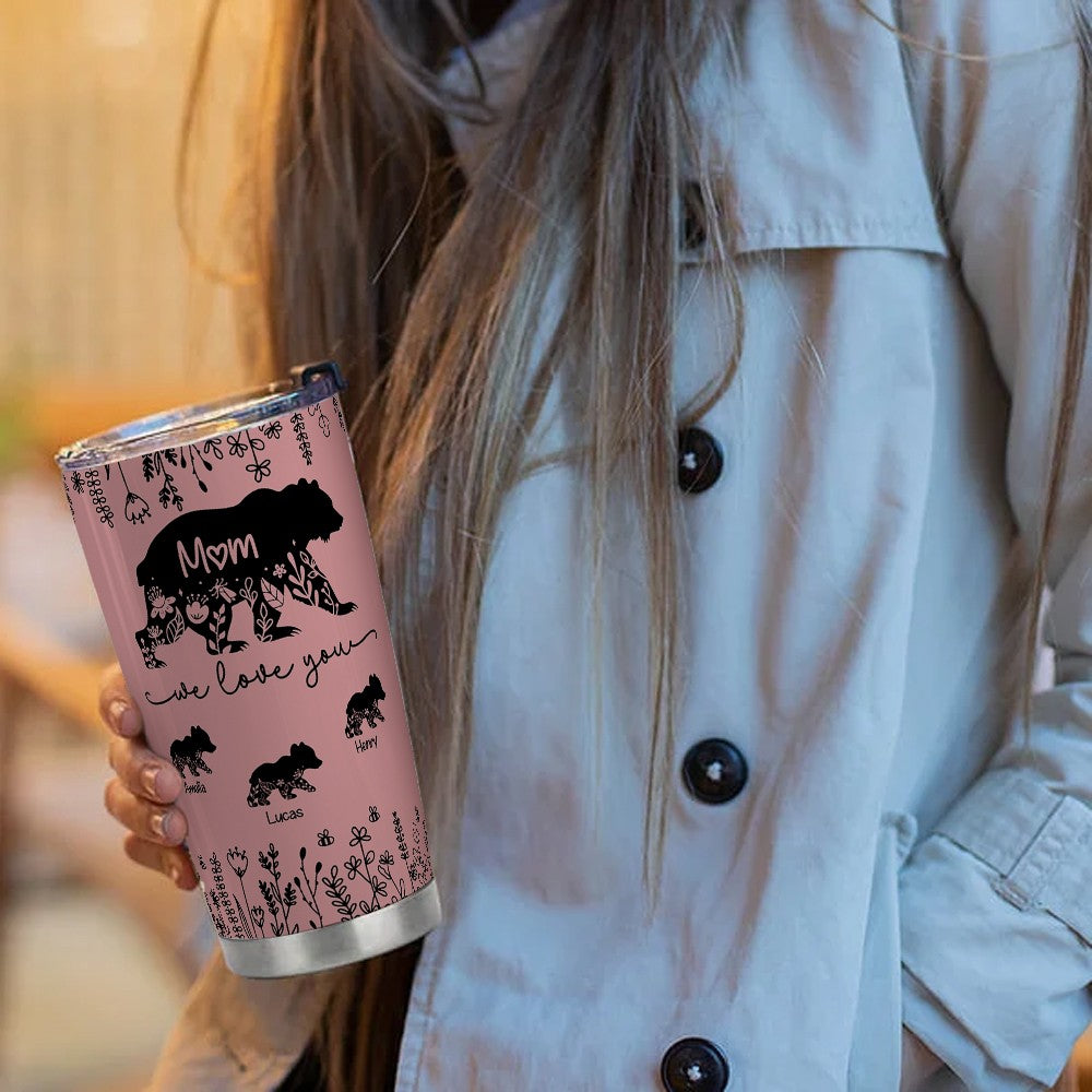 Personalized Names Floral Mama Bear & Cubs Tumbler, Stainless Steel 20oz Travel Mug with Straw & Lid, Birthday/Mother's Day Gift for Her/Mom/Grandma