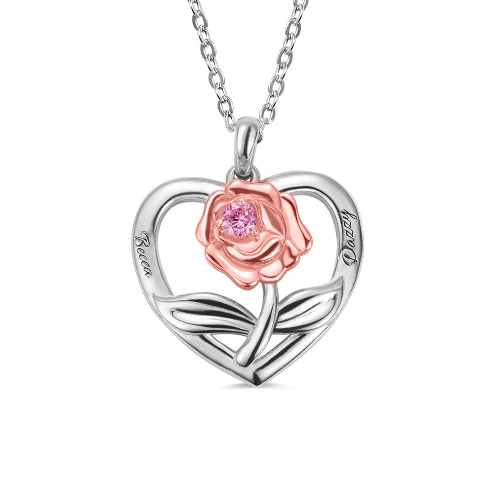 Personalized Rose Heart Necklace with Birthstone Sterling Silver