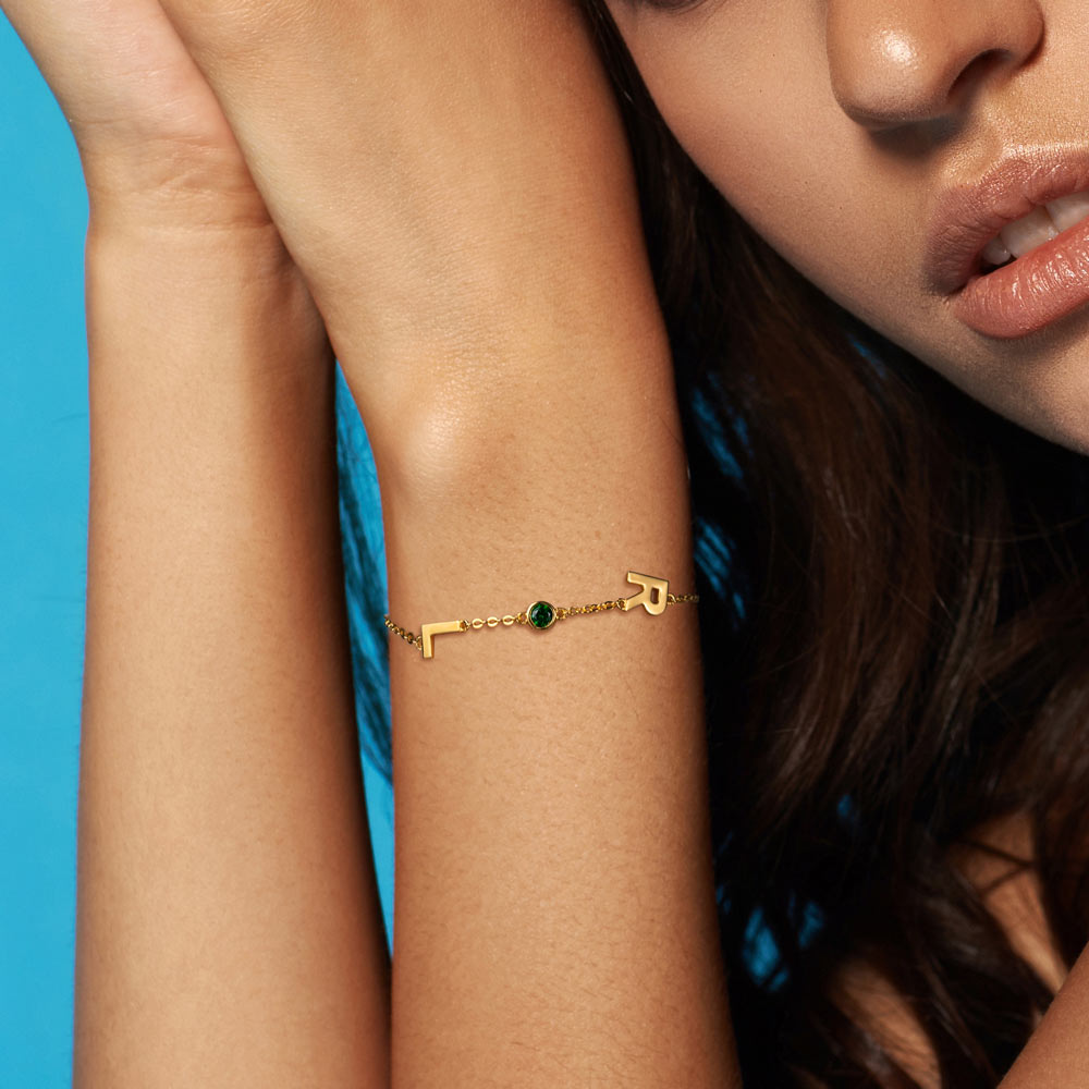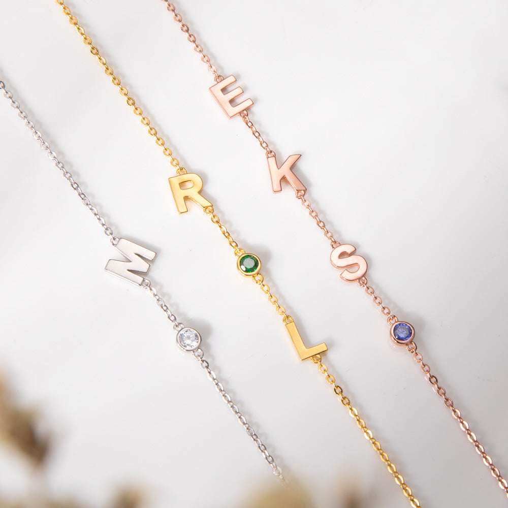 Dainty bracelet for daily outlook! The chain connects up to 6 initials and 1 birthstone that are all made for your custom needs. To make it a beautiful gift for friends or self, personalize it with the wearer's name or special words. Note that we'll put the birthstone in the middle of initials by default if the selected number of initials is two.
