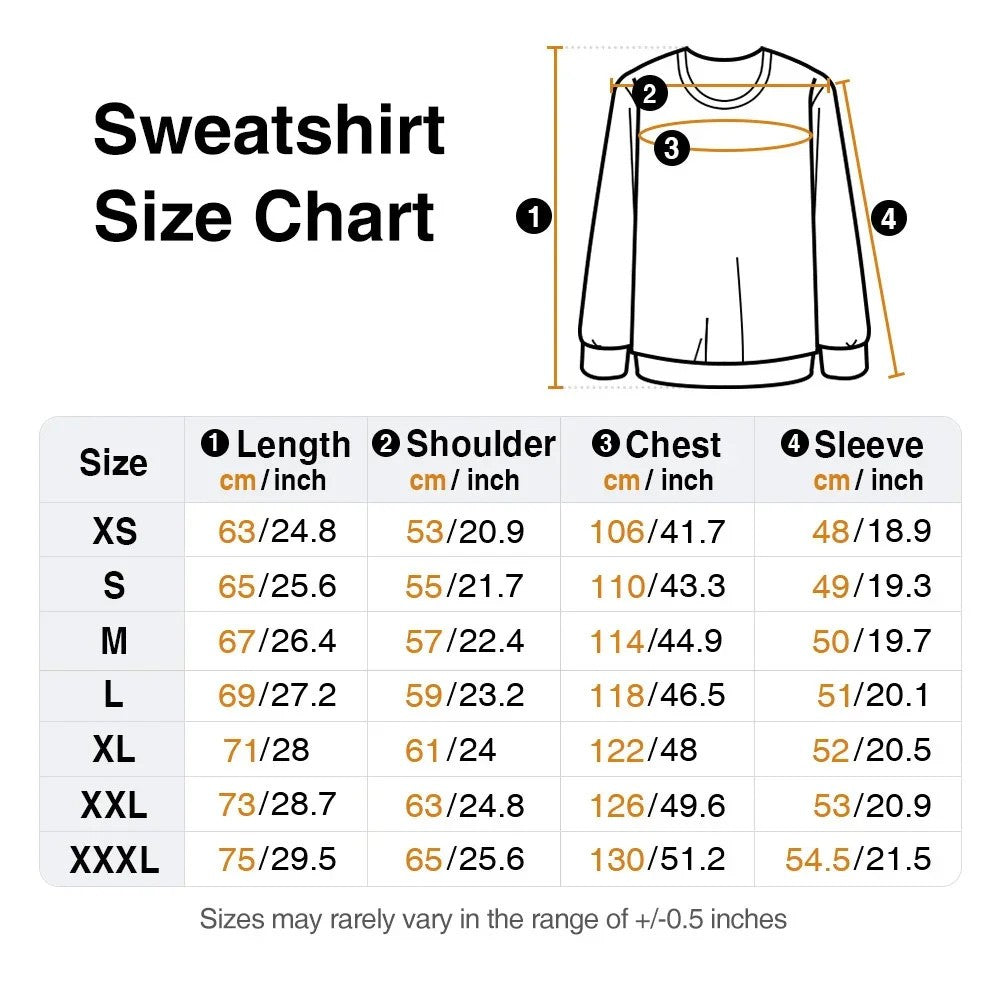 | Measurements | T-shirt Size: S, M, L, XL, 2XL, 3XL; Sweatshirt Size: S, M, L, XL, 2XL, 3XL, 4XL, 5XL |