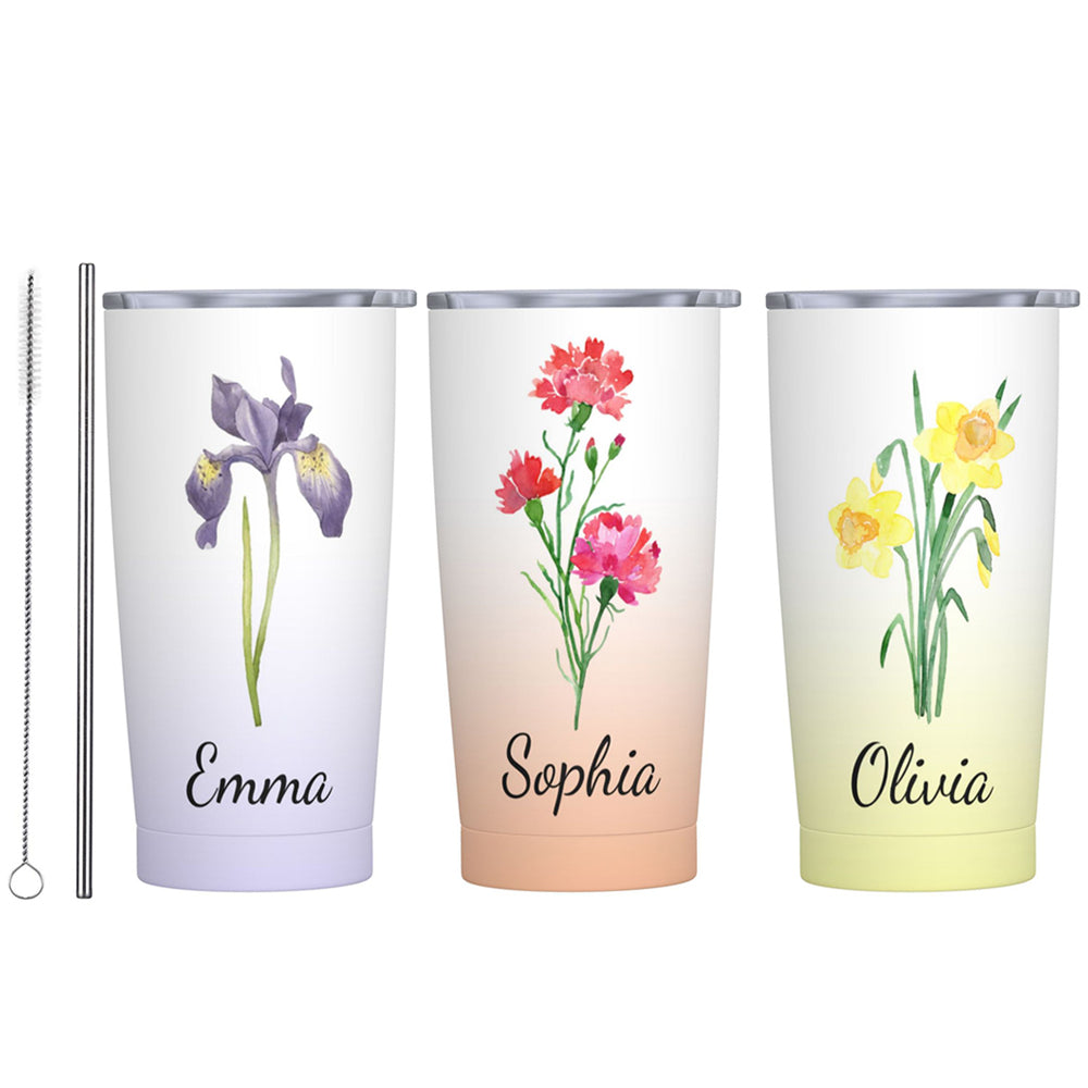Custom Birth Flower & Name - Each tumbler showcases a watercolor birth flower gradient pattern tailored with the recipient's name, enhancing the gift with a personal touch.